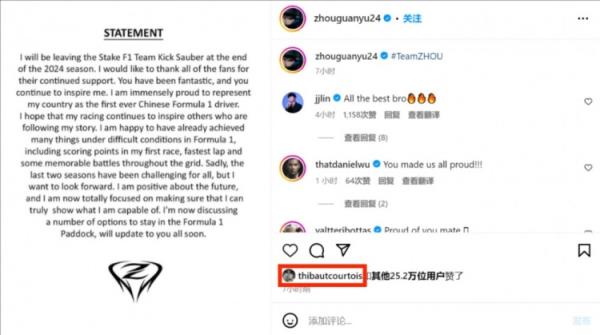 11月6日,F1索伯车队官方宣布周冠宇和博塔斯赛季结束后离开车队,随后,周冠宇发布声明告别索伯车队,库尔图瓦也给周冠宇此条社媒点赞。