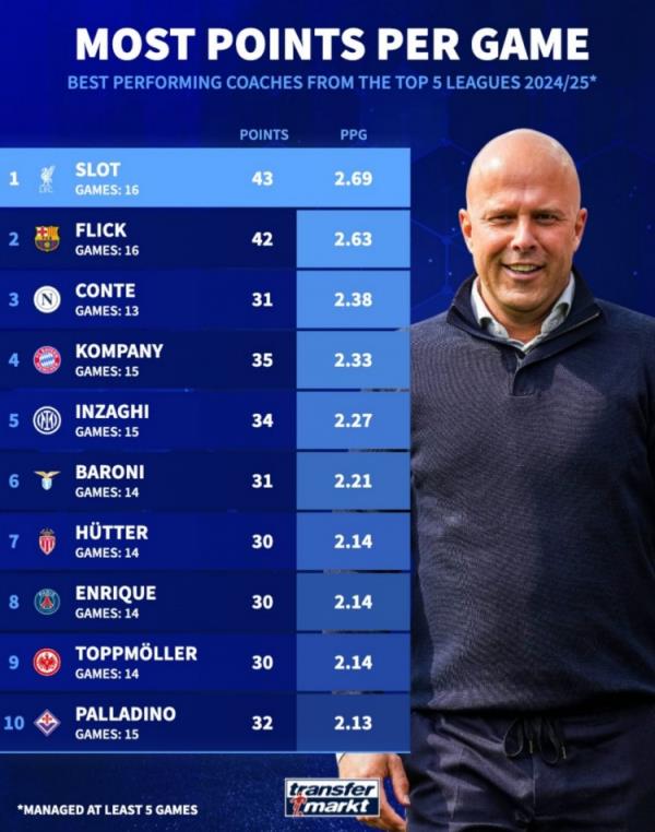 11月8日讯 德国转会市场统计了本赛季至今,五大联赛主帅带队的场均积分。其中,红军新帅斯洛特积2.69分排在第一,弗里克2.63分紧随其后,孔蒂和孔帕尼分列第三和第四。