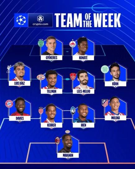 11月8日讯 欧冠联赛阶段第四轮比赛已经全部结束,欧冠官方评选出了本周的最佳阵容。其中,迈尼昂守门,戴帽的路易斯-迪亚斯和约克雷斯入选,阿方索、莫利纳等人在列。