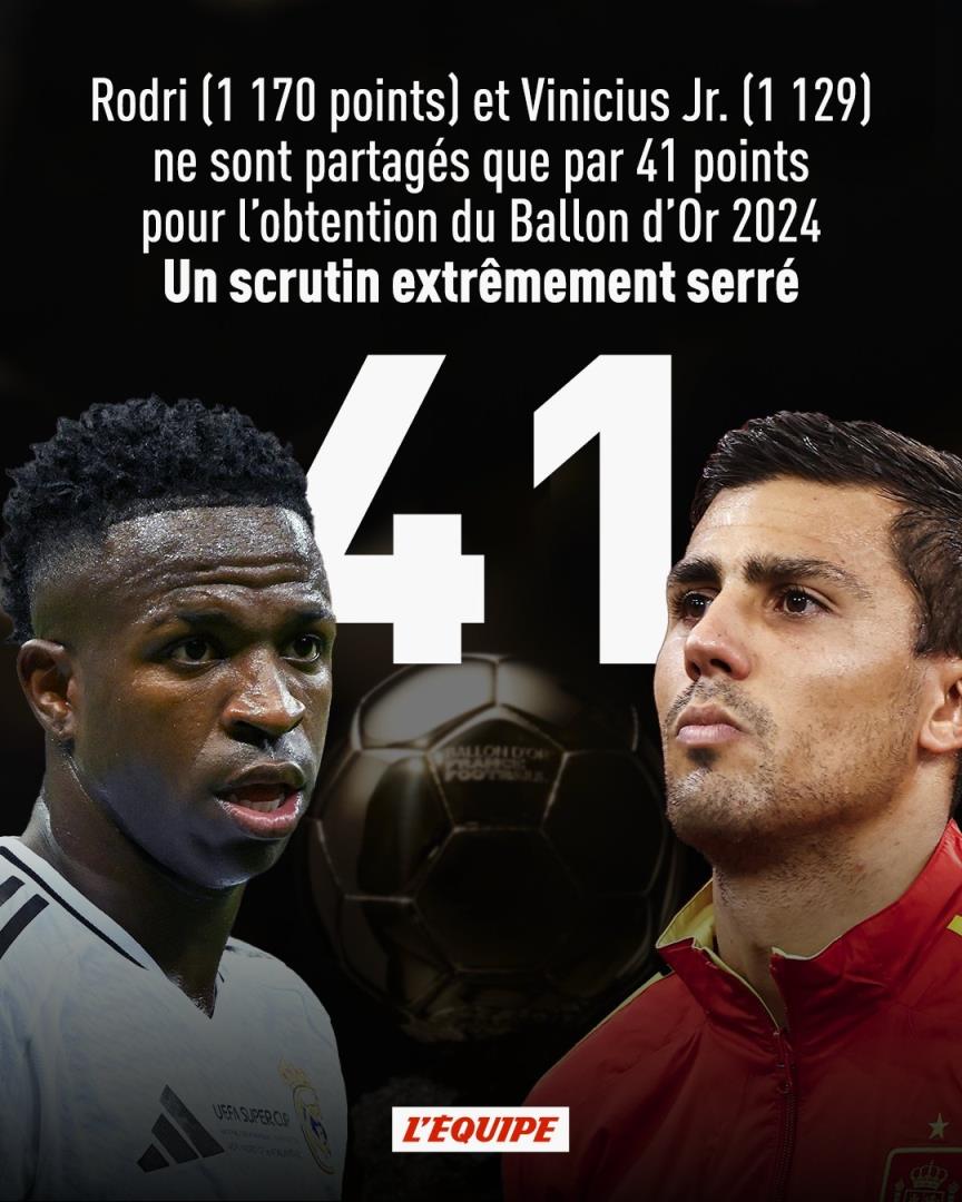 官方表示,金球奖得主罗德里对维尼修斯的领先优势是41分。罗德里得分1170分,维尼修斯1129分。