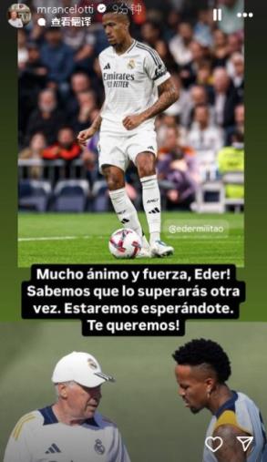 赛后,安切洛蒂社媒写道:“大家会给你鼓励和力量,我们知道你会再次渡过难关。我们会等你。我们爱你!”