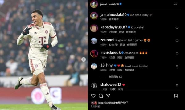 赛后,穆西亚拉在社媒庆祝赢球:今天工作完成了。