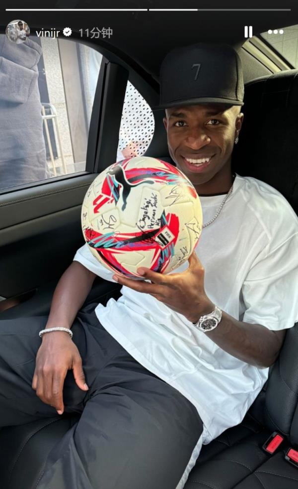 维尼修斯也更新了社媒,晒出自己手捧比赛用球的照片,笑得十分开心。可以看到,皇马队友已经为维尼修斯在比赛用球上签了名。