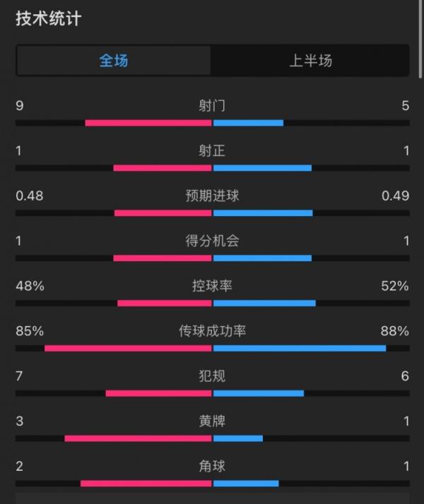 切尔西vs阿森纳半场主要数据↓(左切尔西-右阿森纳)