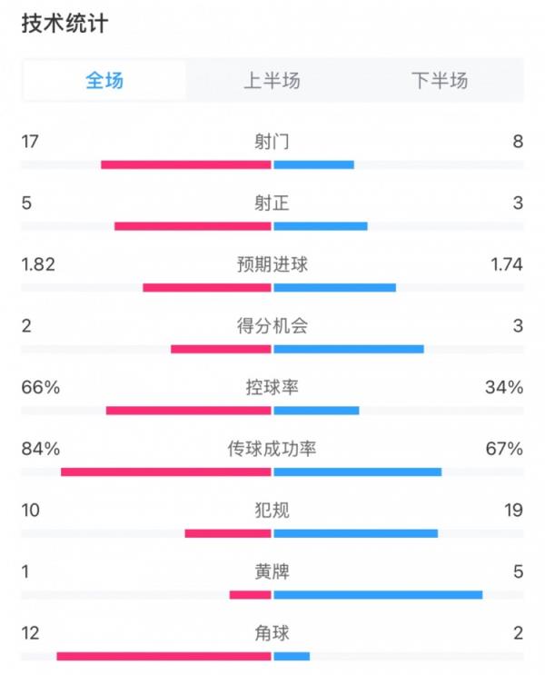 11月11日讯 英超第11轮,热刺1-2不敌伊普斯维奇,全场数据方面,热刺17次射门仅取得1粒进球。