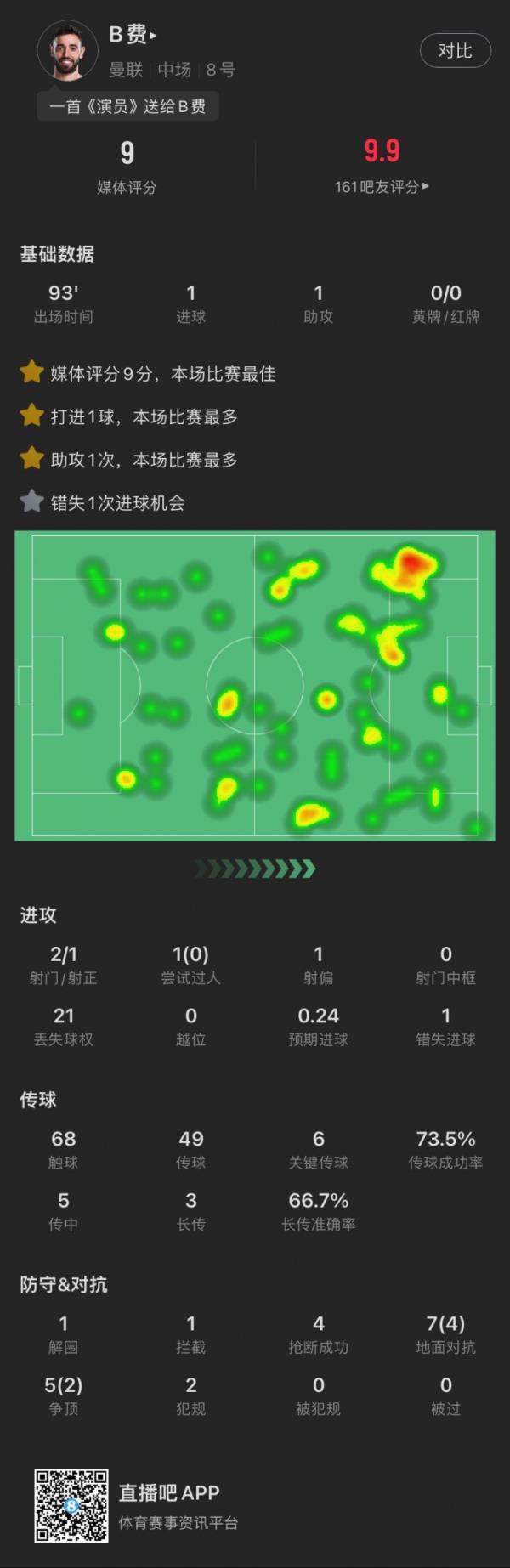 11月10日讯 在刚刚结束的英超11轮比赛中,曼联3-0完胜莱斯特城。本场比赛,B费独造三球,传射建功的同时还造乌龙,他获得了Sofascore9.0的评分,全场最高。