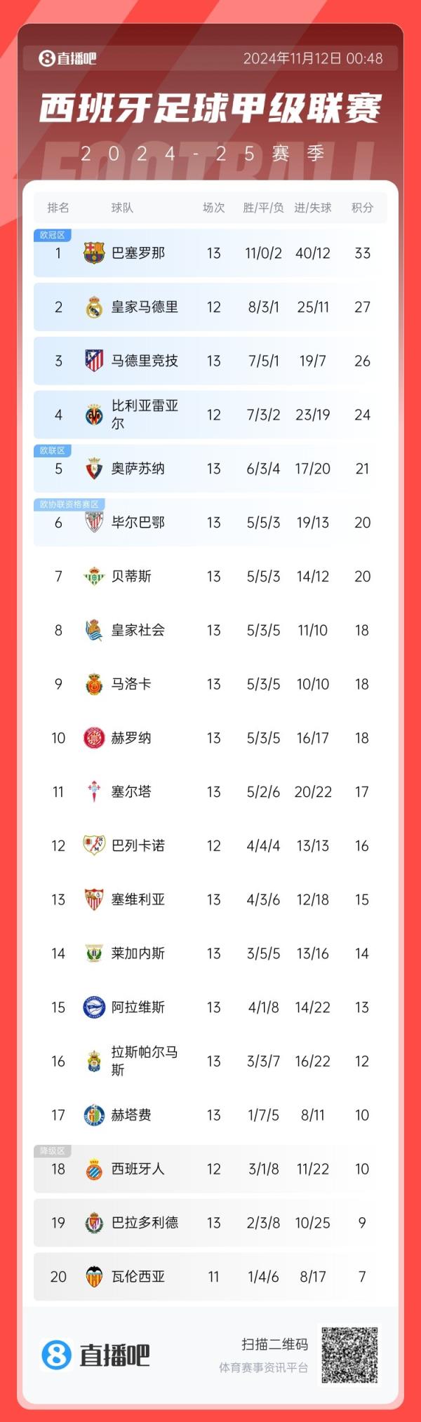 11月12日讯 《每日体育报》列出本赛季如果没有VAR情况下的西甲积分榜,巴萨、皇马、马竞排名前三。