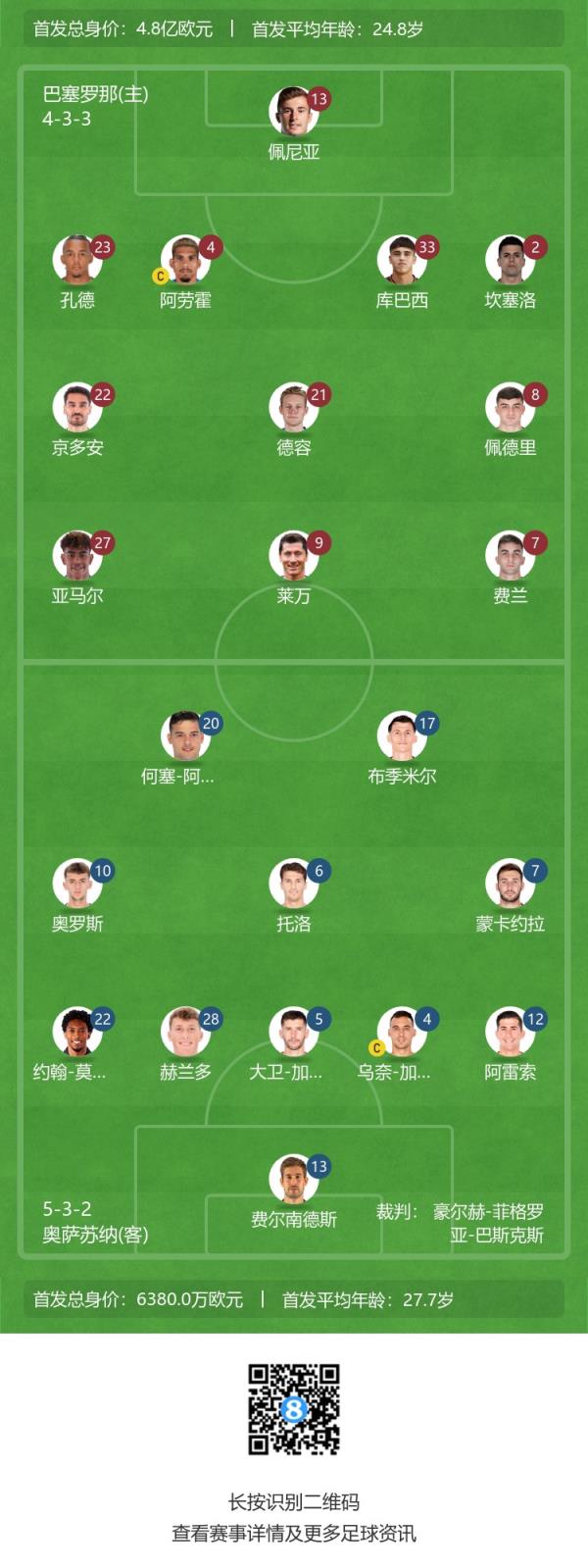巴萨首发:13佩尼亚、2-坎塞洛、4-阿劳霍、33-库巴西、23-孔德、21-德容、22-京多安、8-佩德里、7-费兰-托雷斯、27-亚马尔、9-莱万