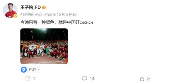 本场比赛,王子铭替补登场,他在补时阶段制造对手红牌。赛后,王子铭在社媒晒出国足大合照,并配文:今晚只有一种颜色,就是中国红