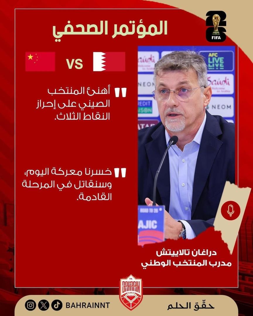 11月15日讯 世预赛亚洲区第三阶段C组第5轮,中国男足客场1-0绝杀巴林。赛后巴林主帅塔拉吉奇出席发布会,祝贺了中国队赢球。