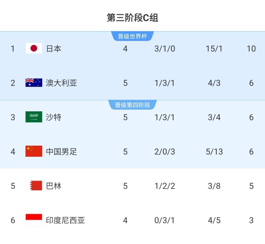 本场赛前,同一轮澳大利亚与沙特0-0战平,两队同积6分分列小组二三。这也意味着积5分的巴林如果战胜中国队,将升至小组第二。然而事情的发展并不如巴林人所愿。
