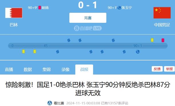 11月15日讯 国足1-0绝杀巴林,两连胜后5战拿到6分!
