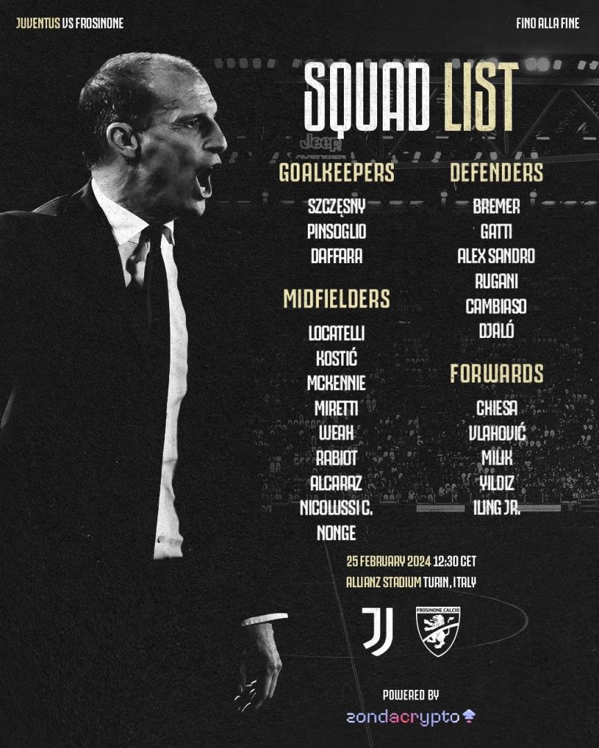 2月25日讯 北京时间周日晚间的意甲第26轮比赛,尤文将坐镇主场迎战弗洛西诺内。目前,斑马军团已经公布了本场比赛的大名单,小基耶萨、弗拉霍维奇领衔锋线。