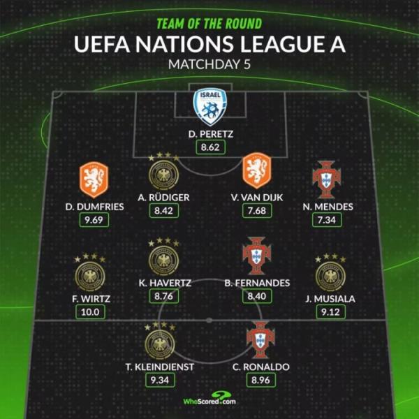 WhoScored本赛季欧国联A级第五轮最佳阵容: