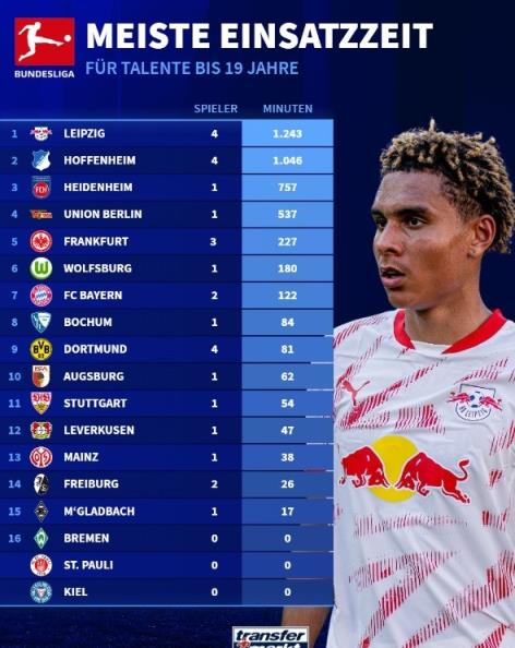 11月18日讯 德转盘点德甲各队19岁以下年轻球员最多出场时间,莱比锡4人&累计1243分钟第一,拜仁第七。