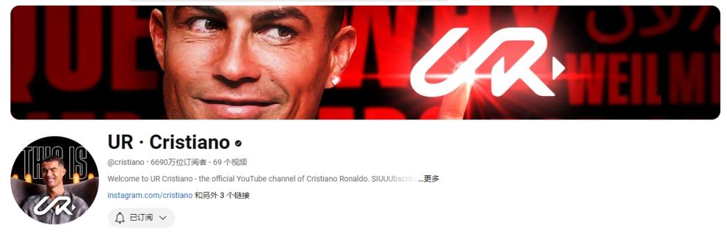 C罗在北京时间8月21日晚上约21点开通了自己的YouTube频道,两天时间不到订阅粉丝数达到了3000万人。