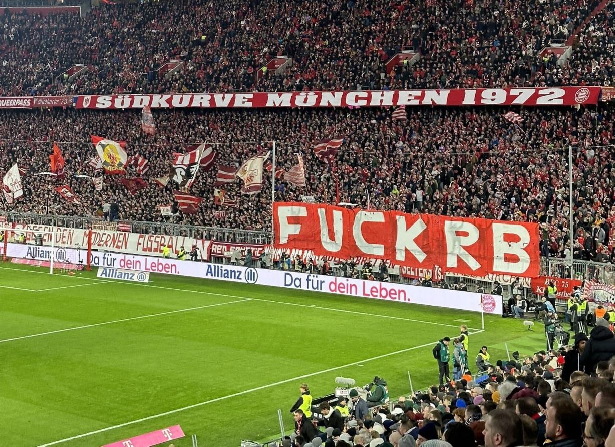 2月25日讯 德甲第23轮,拜仁主场对阵莱比锡的比赛正在进行。比赛中,看台上的拜仁球迷拉出具有挑衅意味的横幅“FxxkRB”,表达对红牛集团的反对。