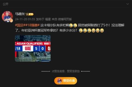 知名记者马德兴更新社媒点评:这卡塔尔队有多烂啊,居然被阿联酋打了5个!没法理解了,年初亚洲杯赛冠军咋拿的?有多少水分?