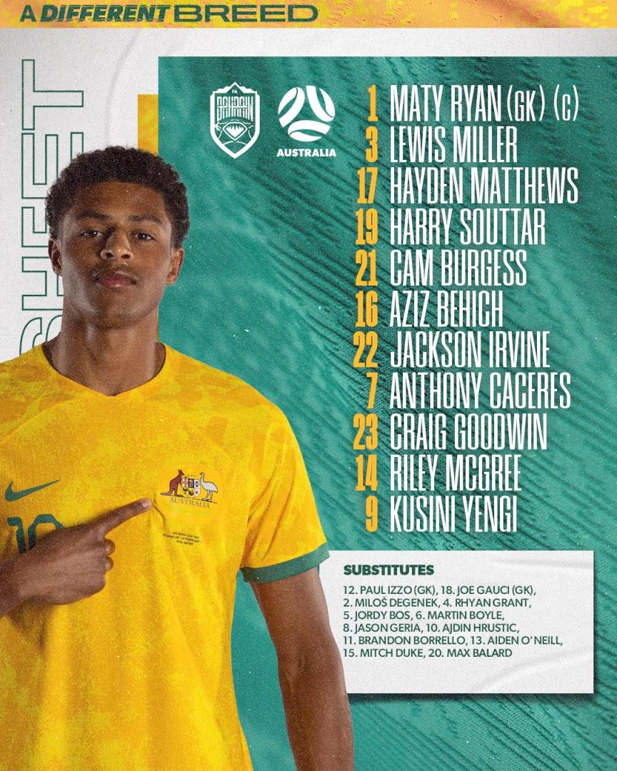 澳大利亚首发:1-马修-瑞安、3-刘易斯-米勒、17-海登-马修斯、19-哈里-苏塔尔、21-卡梅隆-伯吉斯、16-阿齐兹-贝希奇、22-杰克逊-埃尔文、7-安东尼-卡塞雷斯、23-克雷格-古德温、14-莱利-麦吉、9-延吉