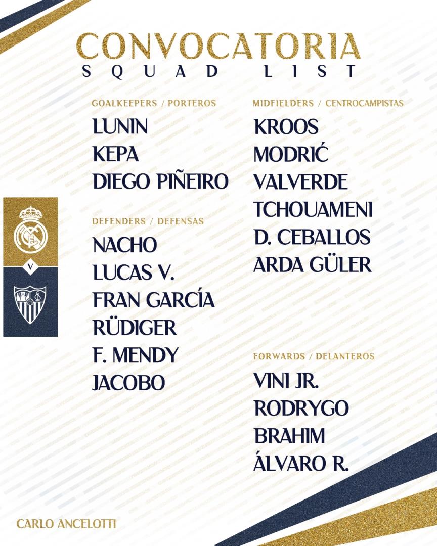 2月25日讯 北京时间下周一凌晨4:00,皇马将在西甲第26轮中迎战塞维利亚。赛前,皇马公布了本场比赛的大名单。其中,何塞卢、贝林厄姆等多人因伤缺战,卡马文加和卡瓦哈尔停赛。
