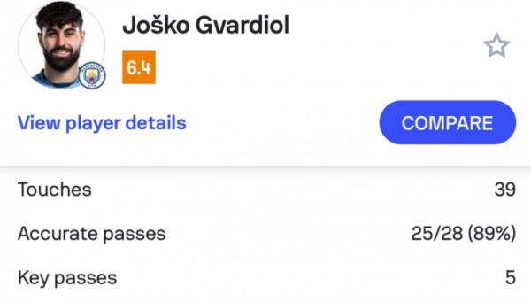 上半场,格瓦迪奥尔送出了5次关键传球,而在本场比赛之前,他在英超单场关键传球最高纪录也只有3次。不过,格瓦迪奥尔在防守端发挥欠佳,他有1次失误导致球队丢球。
