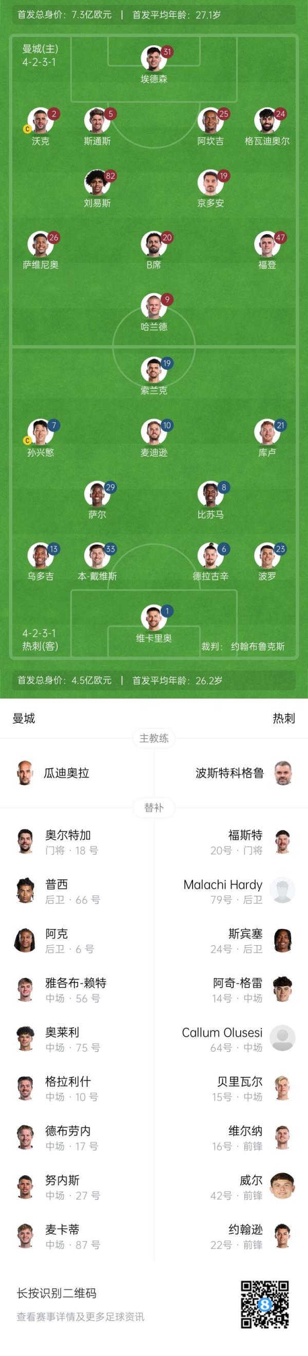 曼城首发:1-埃德森、2-沃克、5-斯通斯、25-阿坎吉、24-格瓦迪奥尔、82-刘易斯、19-京多安、20-B席、26-萨维尼奥、47-福登、9-哈兰德