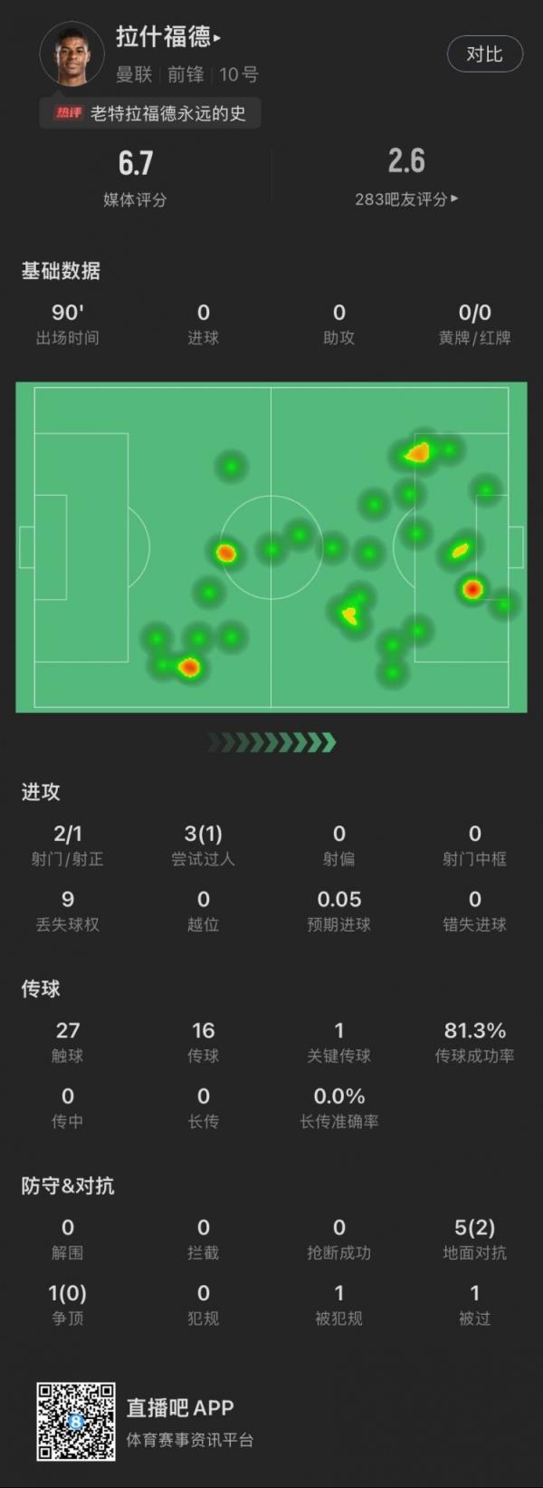 2月25日讯 在刚刚结束的英超第26轮比赛中,曼联主场1-2遭到富勒姆绝杀。本场比赛,拉什福德客串中锋打满全场。获评6.7分,曼联队内倒数第三低。