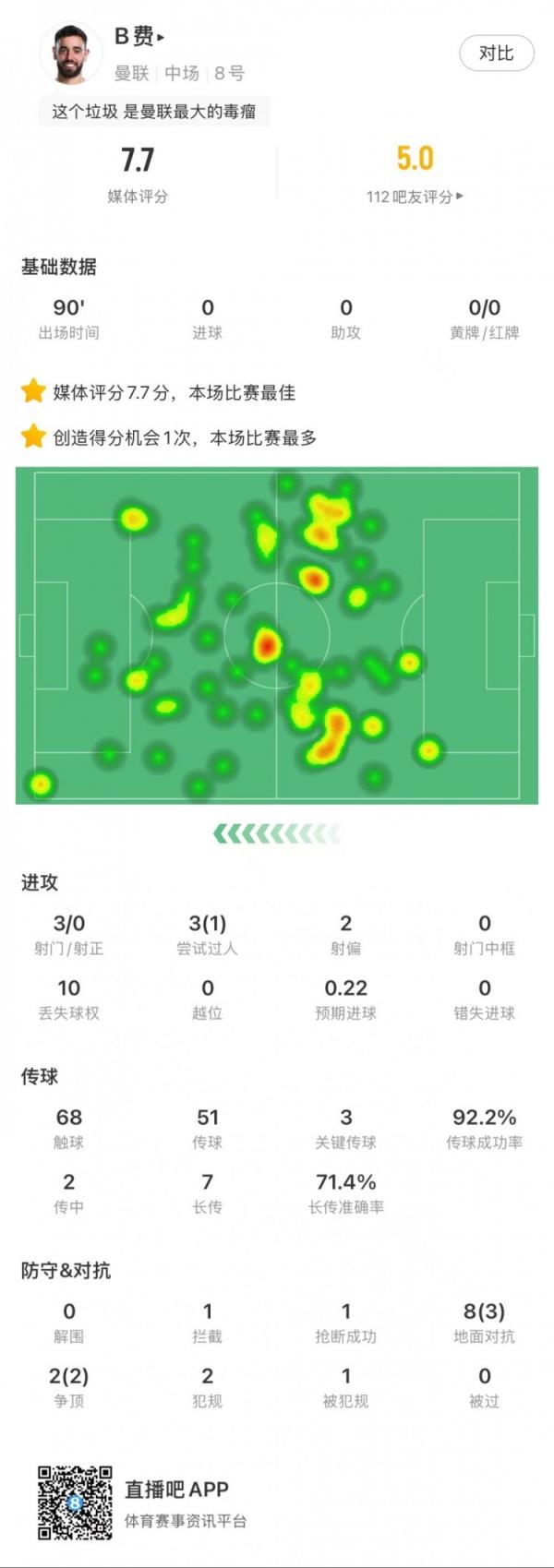 11月25日讯 英超第12轮,伊镇1-1曼联。B费全场数据: