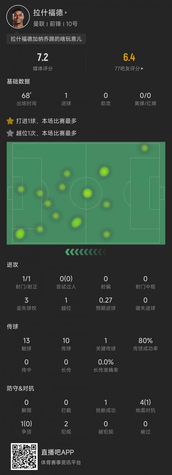 比赛期间,拉什福德仅有13次触球,10次传球,传球成功率80%,送出1个关键传球。