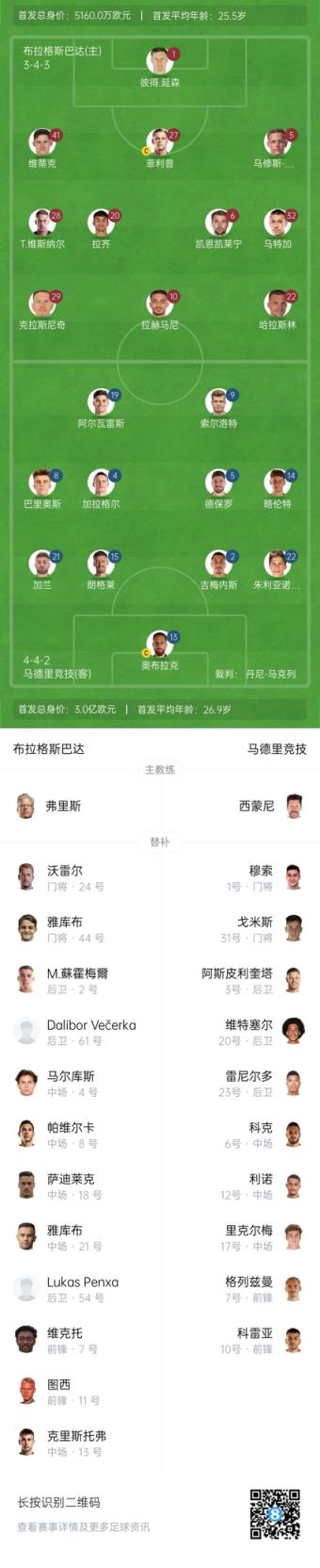马竞首发:13-奥布拉克、15-朗格莱、2-吉梅内斯、21-加兰、22-西蒙尼、4-加拉格尔、5-德保罗、8-巴里奥斯、14-略伦特、19-阿尔瓦雷斯、9-索尔洛特