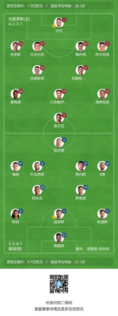曼城首发:31-埃德森、25-阿坎吉、5-斯通斯、3-迪亚斯、6-阿克、16-罗德里、27-努内斯、8-科瓦西奇、20-B席、47-福登、9-哈兰德