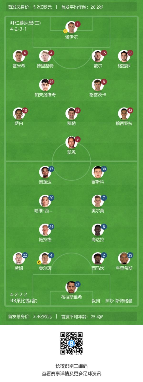拜仁首发:1-诺伊尔、4-德里赫特、15-戴尔、22-格雷罗、6-基米希、45-帕夫洛维奇、8-格雷茨卡、25-穆勒、42-穆西亚拉、10-萨内、9-凯恩