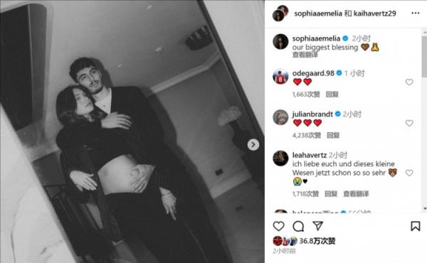 11月29日讯 哈弗茨妻子索菲娅-韦伯更新社媒,晒出自己的怀孕照。