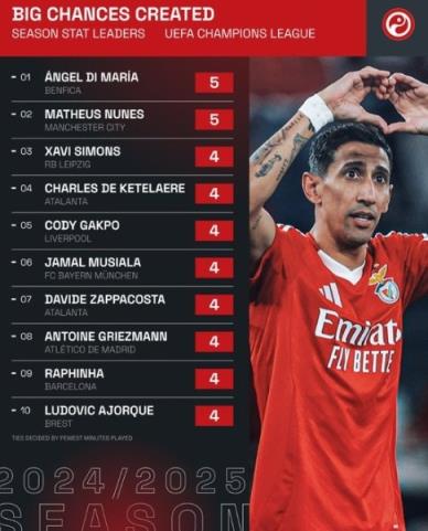 11月29日讯 本赛季欧冠联赛阶段已经进行了5轮比赛,《Squawka》统计出了创造绝佳机会最多的球员排名,本菲卡的阿根廷老将迪马利亚和曼城的努内斯以5次并列榜首。