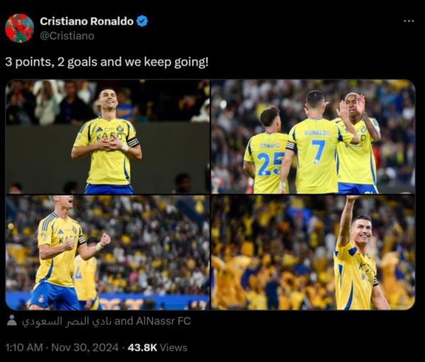 11月30日讯 在刚刚结束的沙特联第12轮比赛中,C罗梅开二度,帮助利雅得胜利击败达马克。赛后,C罗也更新了动态庆祝赢球。