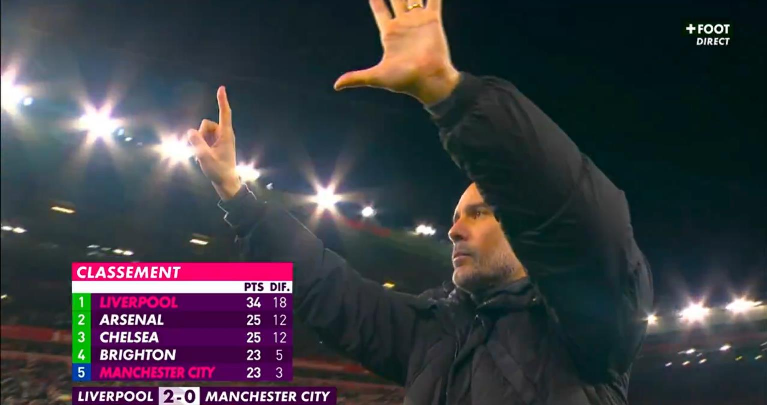 12月02日讯 英超第13轮焦点战,利物浦主场2-0战胜曼城,赛中瓜迪奥拉向看台比出6根手指手势。根据解读,当时是利物浦球迷唱“瓜迪奥拉明天就下课”的歌,瓜迪奥拉以自己拿过6次英超来回击。