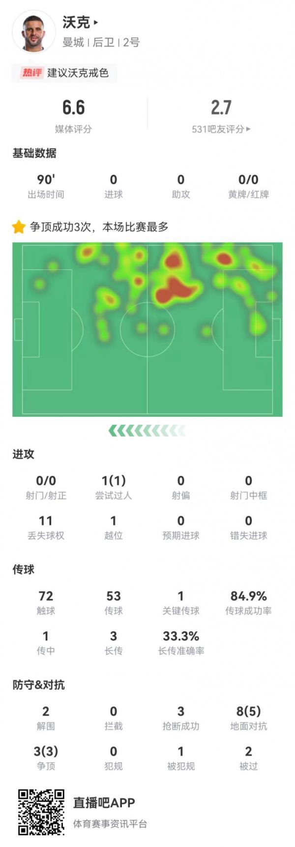 12月2日讯 曼城在本轮英超0-2不敌利物浦,沃克本场数据如下: