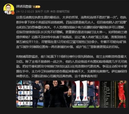 詹俊:这是瓜迪奥拉执教生涯的最低谷,太多的丢球、连败和连续不胜的“第一次”。他执教8年拿下的6个英超冠军战绩彪炳,四连冠更是前无古人,但目前他陷入的“泥潭”也和自己的思维僵化有关。个人觉得防线缺少有力后腰的保护漏洞较多可以理解,但盲目继续信任队长沃克不好理解。更重要的是进攻端打法太单一,如何给哈兰德提供帮助?边路不及时传中执着于地面战,这让“魔人布欧”孤立无援。滑落到排名第五被拉开11分,尽管现在是12月初但卫冕可能性已经很小,冬窗不可能完成“换血”只能针对薄弱位置有一两名新援的补强,或许“抢三”是联赛更现实的目标。