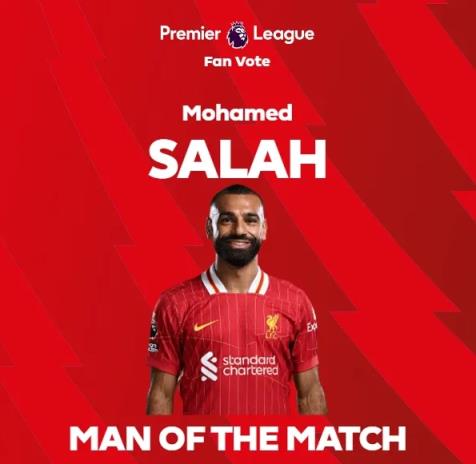 英超官方也在赛后将萨拉赫评选为本场比赛的全场最佳球员。
