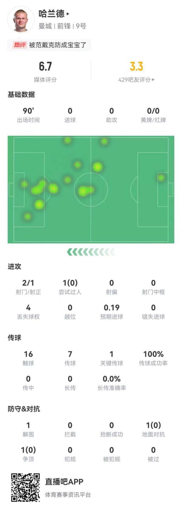 12月2日讯 曼城在本轮英超0-2不敌利物浦,哈兰德本场数据如下:
