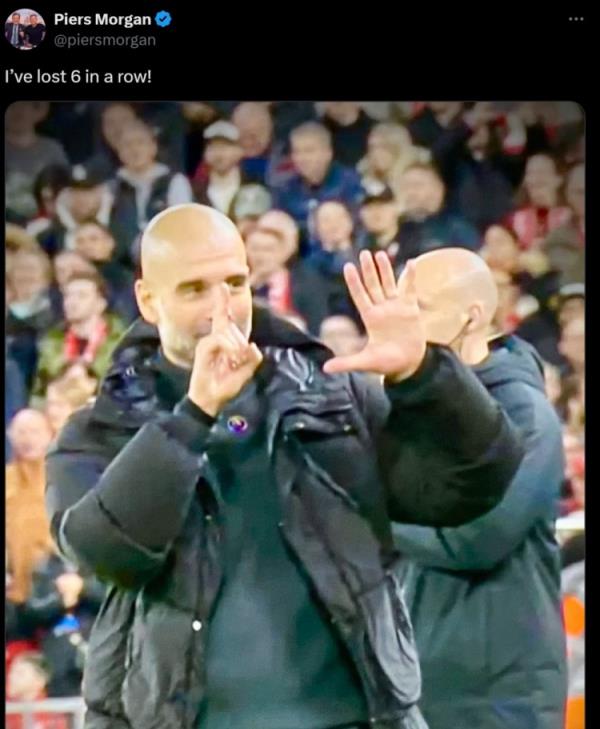 摩根还晒出了瓜帅比6根手指的照片,并写道:我刚刚连续输了6场球。