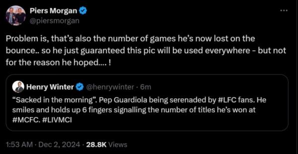 12月2日讯 在刚刚结束的英超焦点战中,曼城0-2不敌利物浦,各项赛事已经7场不胜,其中输掉了6场。比赛中,利物浦球迷唱歌嘲讽瓜帅马上要下课,瓜帅随即比出6根手指,似乎是表示自己夺得了6座英超冠军。
