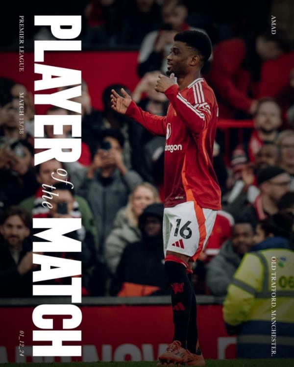 12月2日讯 本轮英超比赛中,曼联4-0大胜埃弗顿。赛后,助攻双响的阿玛德-迪亚洛当选曼联队内最佳球员。