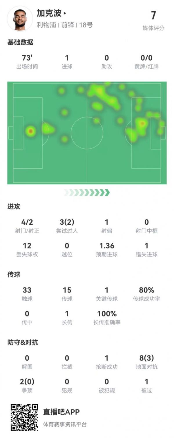 12月2日讯 利物浦在本轮英超主场迎战曼城,加克波本场数据如下: