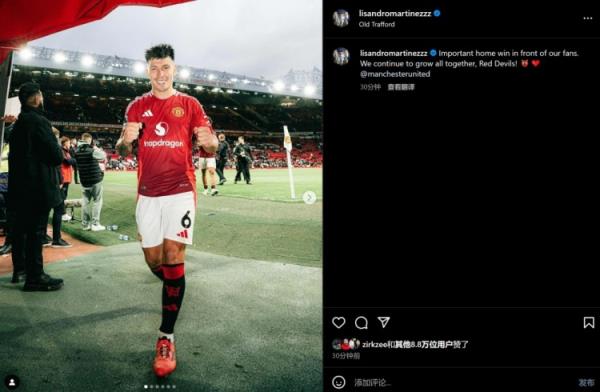 12月2日讯 本轮英超比赛中,曼联主场4-0大胜埃弗顿。赛后,利桑德罗更新了社媒,庆祝球队取胜。