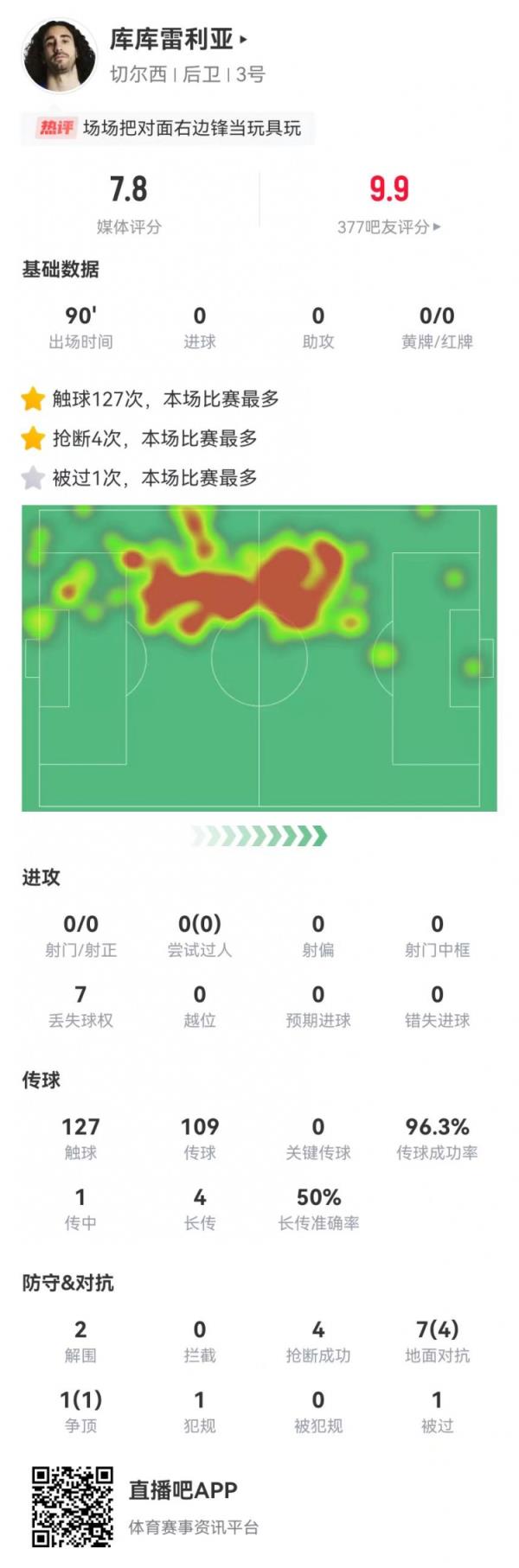 12月1日讯 切尔西在本轮英超3-0完胜维拉,库库雷利亚本场数据如下: