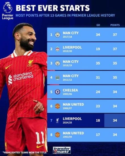 12月3日讯 英超13轮比赛之后,领头羊利物浦拿到34个积分,以9分的优势领跑积分榜。根据数据统计,英超时代前13轮拿到34+积分的球队最终都斩获联赛冠军。