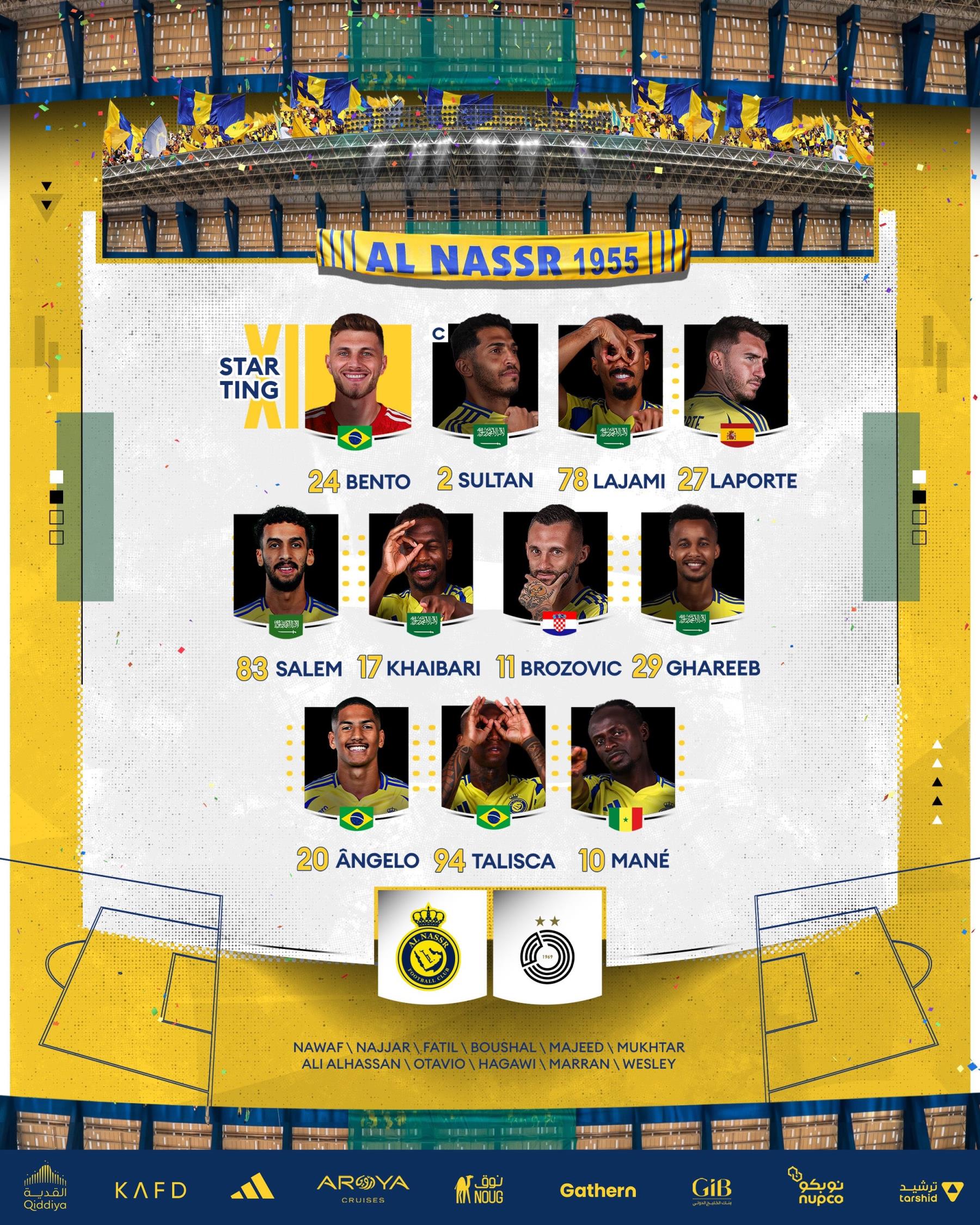 附利雅得胜利首发:24-本托、2-苏丹-哈纳姆、78-拉贾米、27-拉波尔特、83-萨勒姆-纳吉迪、17-哈巴利、11-布罗佐维奇、29-加里卜、20-安吉洛、94-塔利斯卡、10-马内