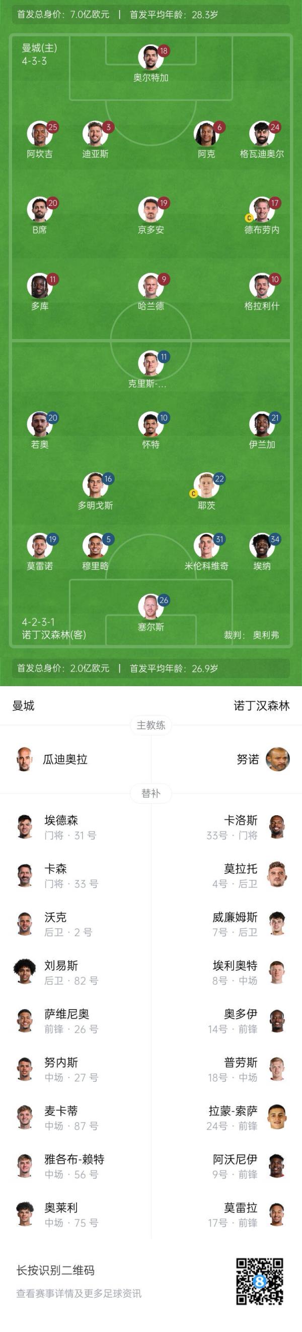 曼城首发:18-奥尔特加、25-阿坎吉、3-鲁本-迪亚斯、6-阿克、24-格瓦迪奥尔、19-京多安、17-德布劳内、20-B席、11-多库、10-格拉利什、9-哈兰德