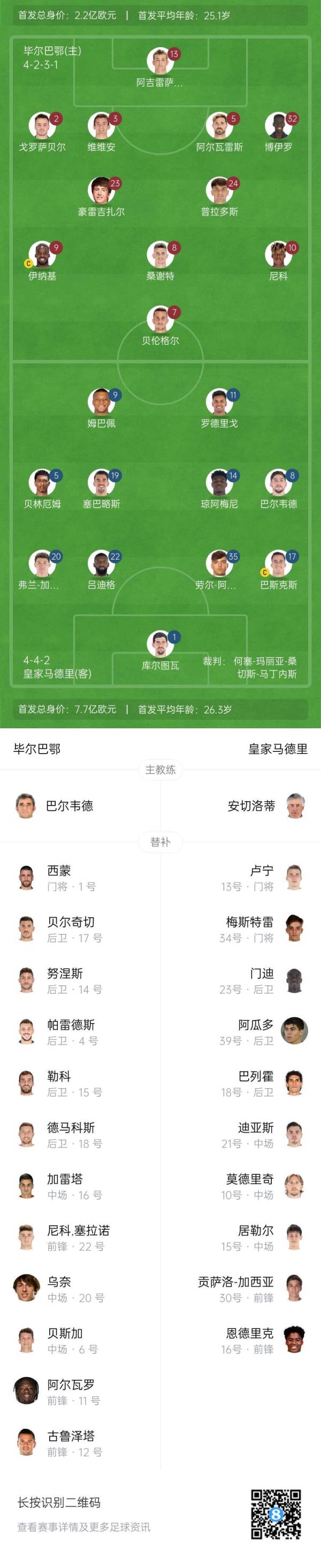 12月5日讯 西甲第19轮,皇马客场对阵毕尔巴鄂。赛前,官方公布了本场的首发名单。
